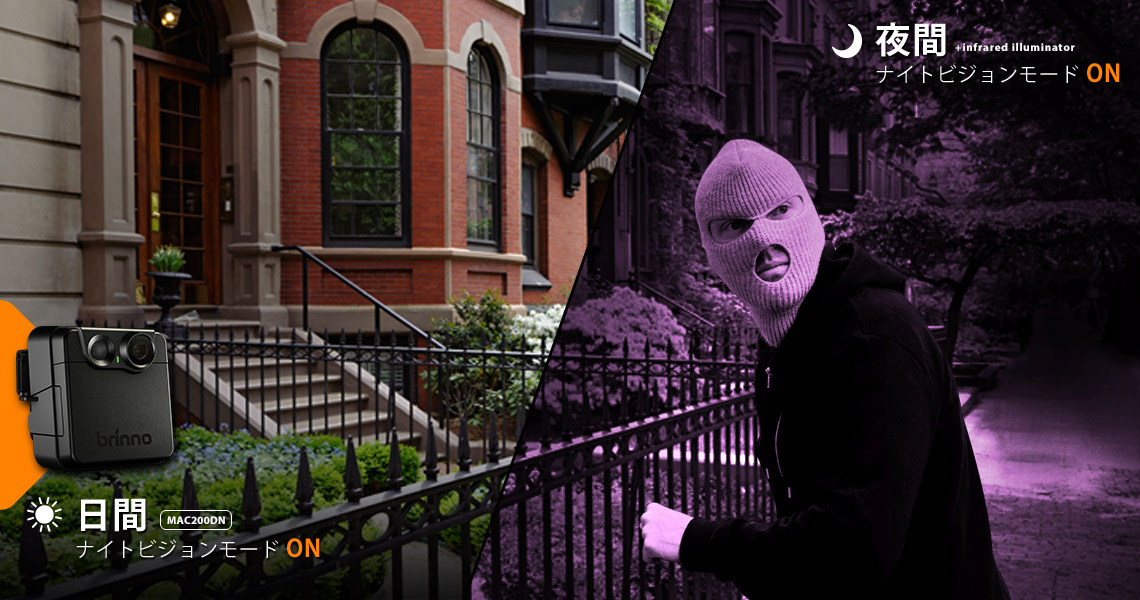 オプション品の赤外線ライト(APL200)を使用すると、真っ暗闇な環境下でもMAC200DNの撮影をアシストし、不審者を不可視光線で明るく照らします。MAC200DNで緯度を設定すると日没と同時にナイトビジョンモードになり、自動で夜間の撮影に適した設定になります。